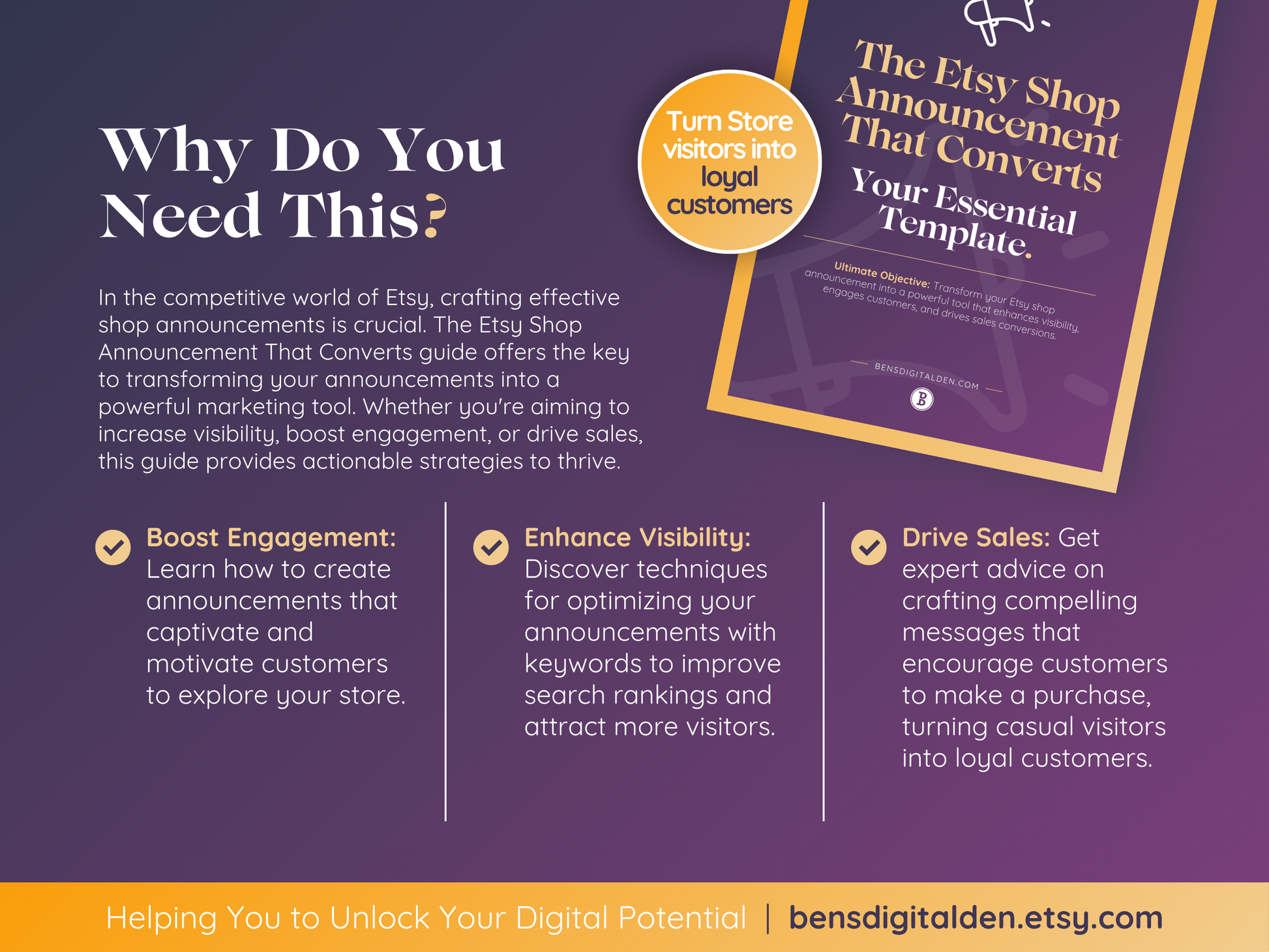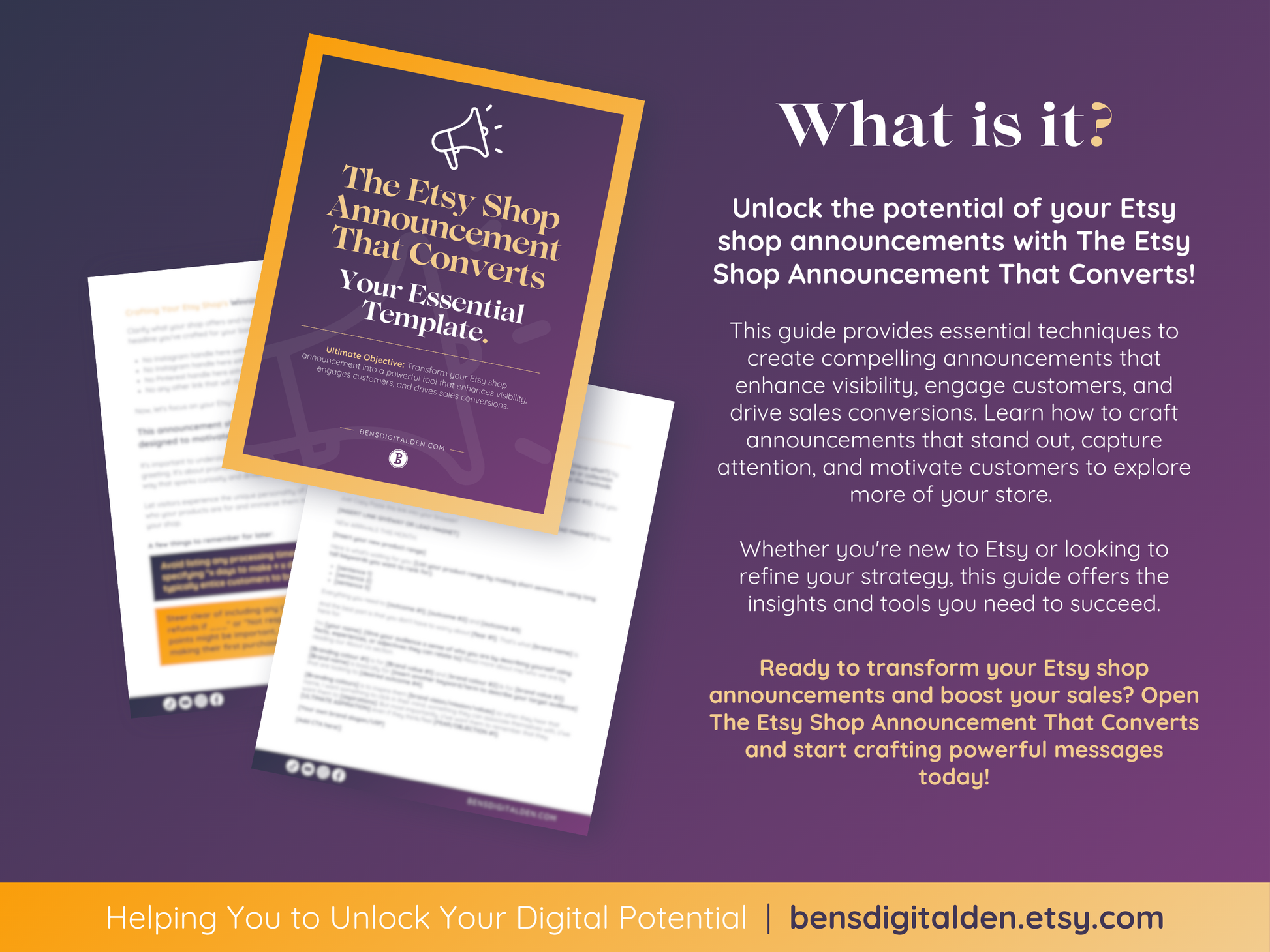 In the competitive world of Etsy, crafting effective shop announcements is crucial. The Etsy Shop Announcement That Converts guide offers the key to transforming your announcements into a powerful marketing tool. Whether you're aiming to increase visibility, boost engagement, or drive sales, this guide provides actionable strategies to thrive.