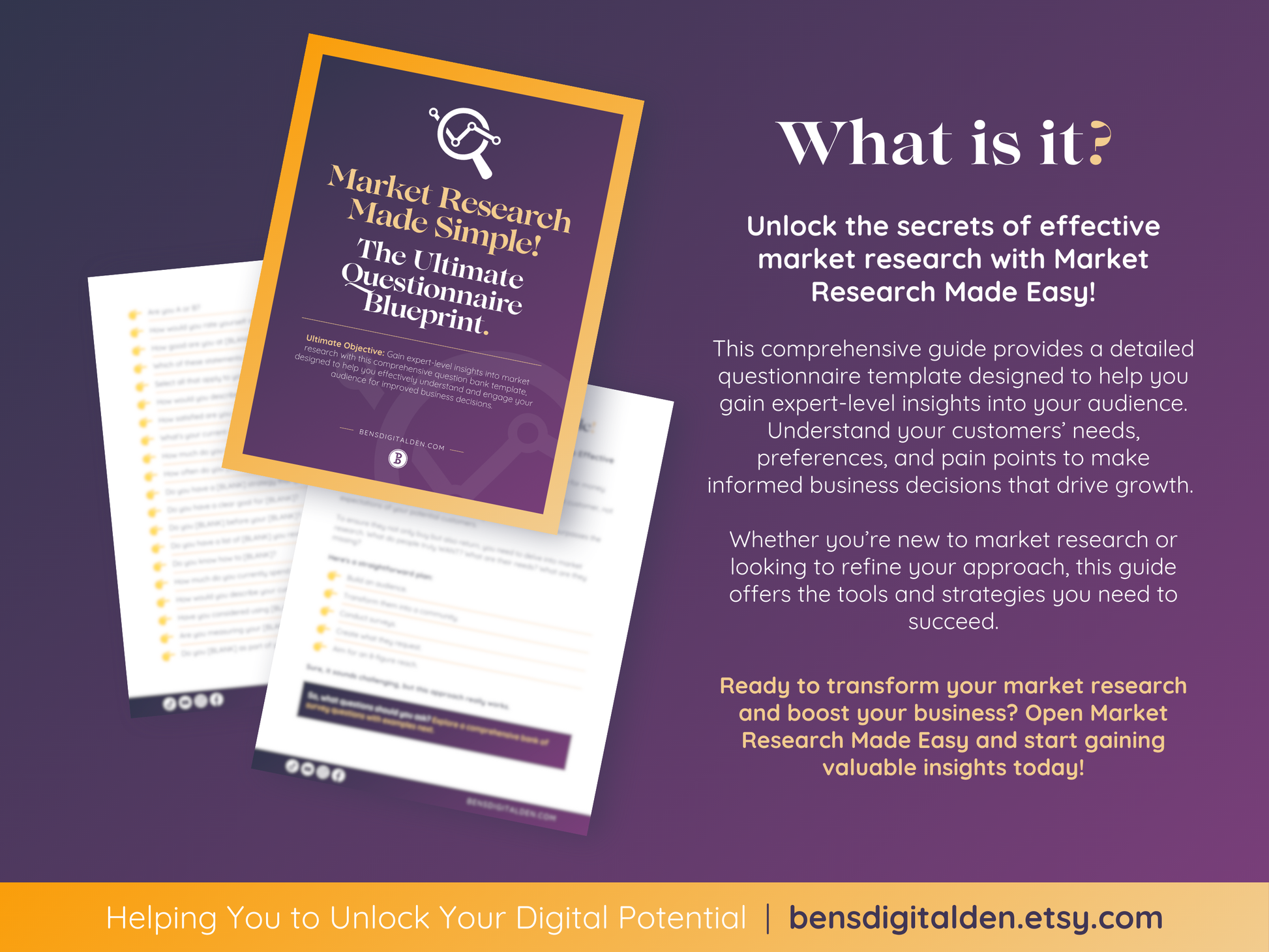 Take Action Now! Don't let ineffective market research hold you back. Grab Market Research Made Easy today and transform your online business. Elevate your brand, increase your engagement, and achieve the success you've always dreamed of. Click "Add to Cart" now and start your journey to market research success!