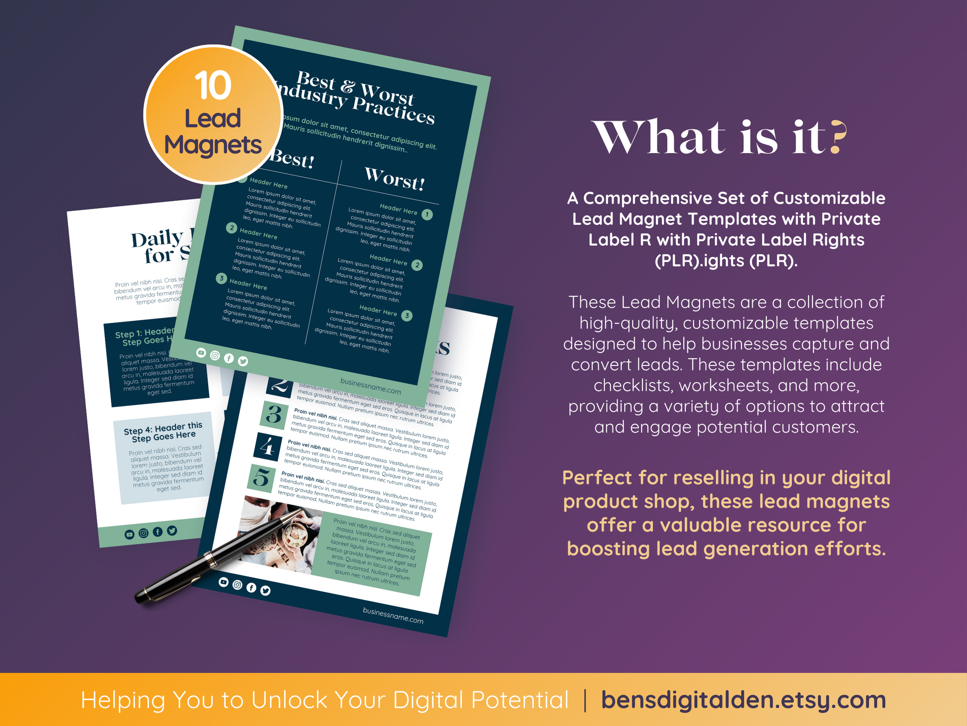 The PLR Lead Magnets is an all-in-one Business Marketing and Email List Builder tool designed to help your customers attract and retain potential clients. Crafted with care and available in an easily editable Canva format, this product is perfect for reselling as is or customized to suit your own store branding. It provides a structured way to create enticing offers that convert visitors into subscribers and customers.
