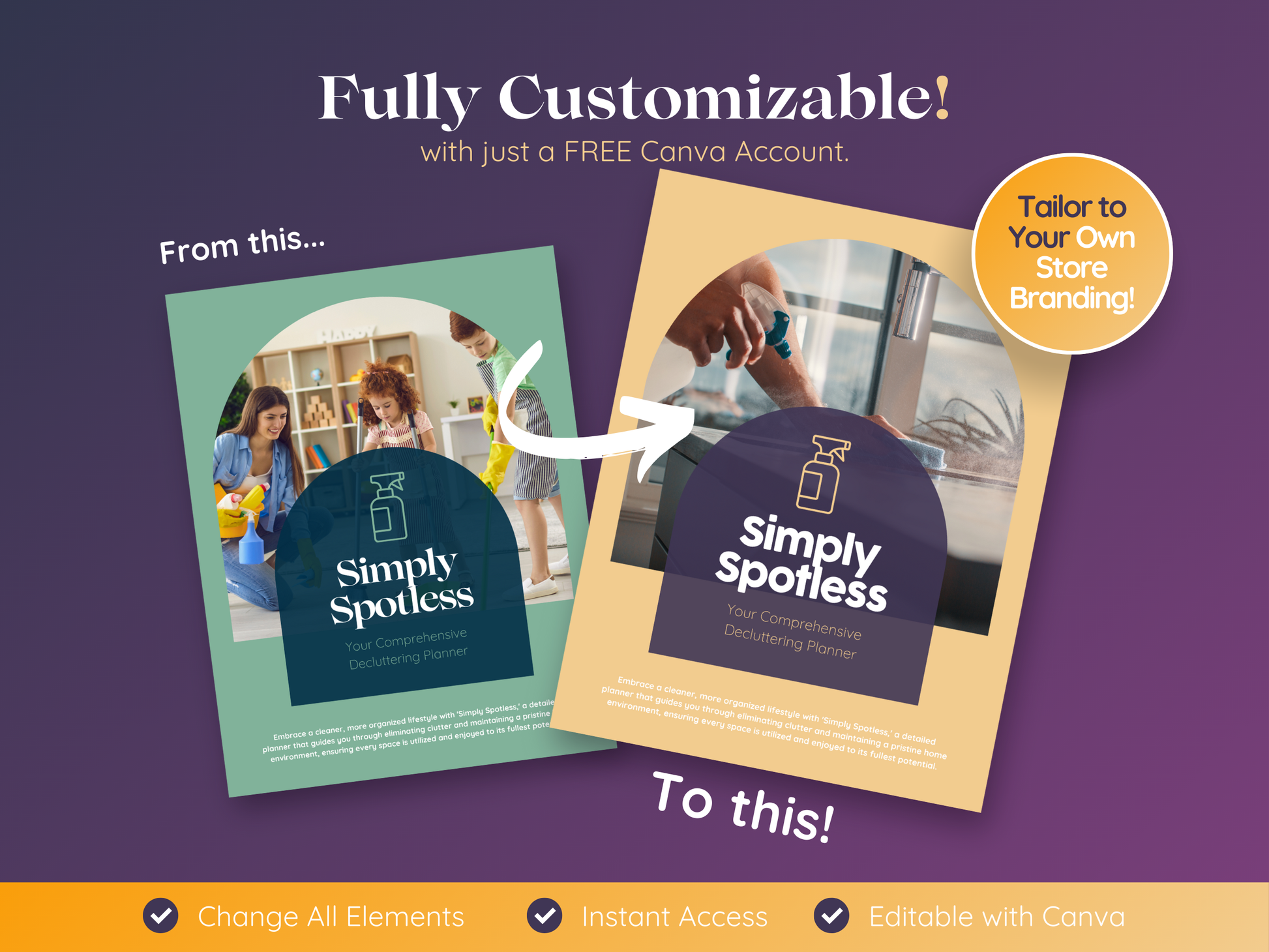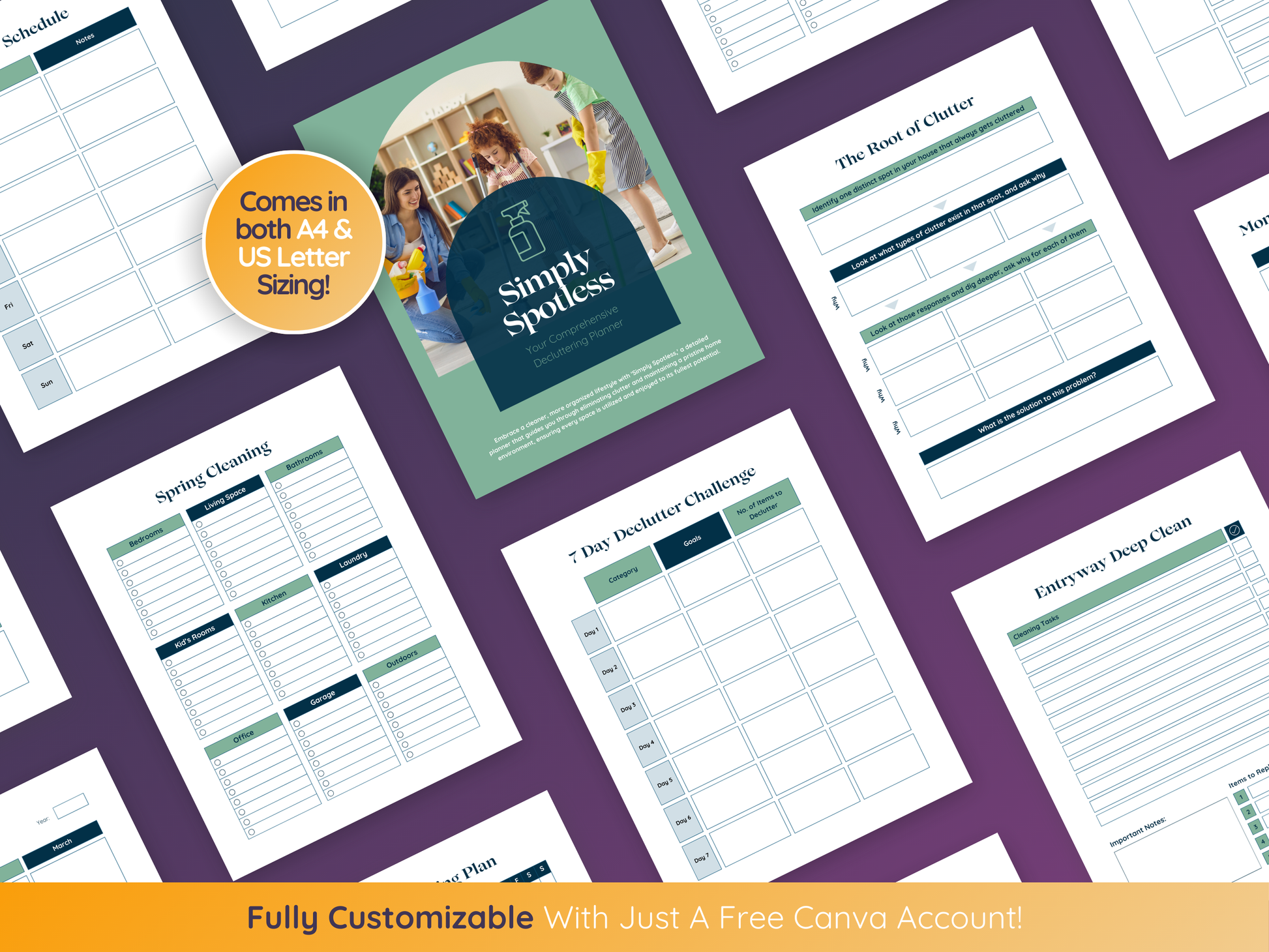 The Decluttering and Cleaning Planner is an all-in-one cleaning planner and declutter checklist designed to help your customers keep their homes organized and clutter-free. Crafted with care and available in an easily editable Canva format, this product is perfect for reselling as is or customized to suit your own store branding. It provides a structured way to manage daily, weekly, and seasonal cleaning tasks, organize decluttering projects, and maintain an overall clean and peaceful environment.
