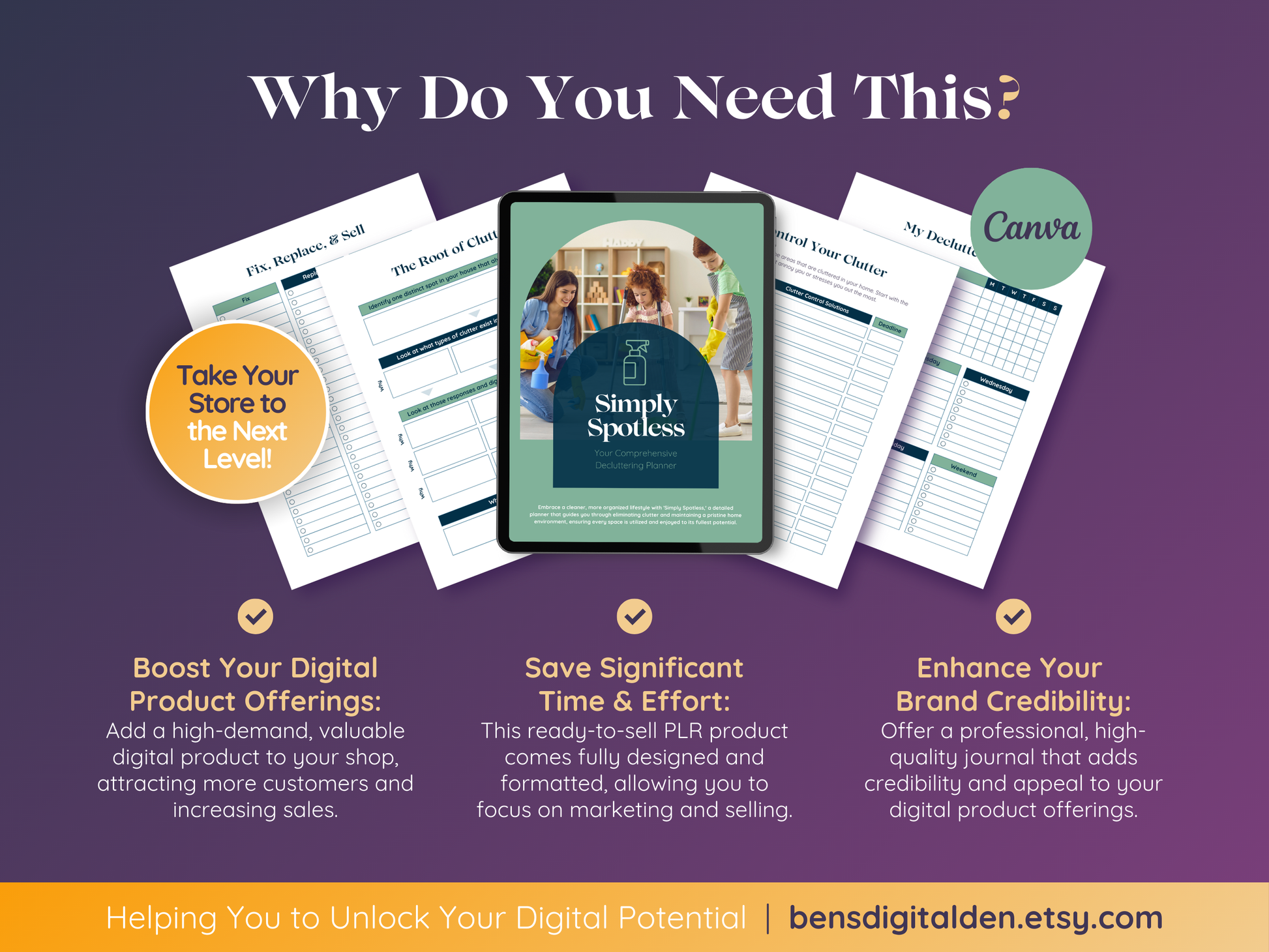 Unlock your potential with the PLR Decluttering and Cleaning Planner, a comprehensive resource containing 40 pages designed to guide your journey through maintaining a clean and organized home. This digital product is perfect for those looking to simplify their lives or for entrepreneurs looking to start or grow their own digital product shop on Etsy. With customizable templates available in both US letter and A4 sizes, this planner offers convenience and the opportunity to generate passive income through PLR resell rights.