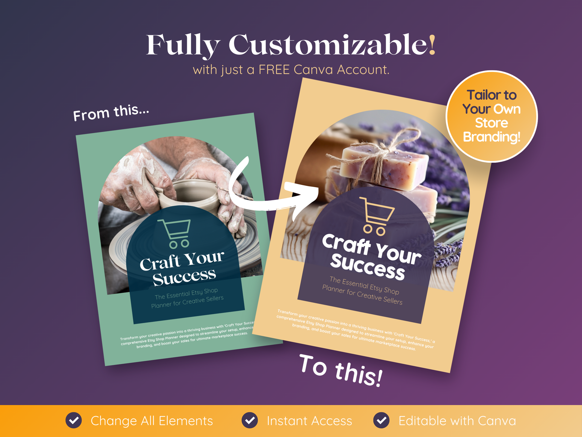 The Etsy Shop Planner is an all-in-one business planner and product planner designed to help your customers streamline their shop operations and enhance their business strategies. Crafted with care and available in an easily editable Canva format, this product is perfect for reselling as is or customized to suit your own store branding. It provides a structured way to manage orders, track expenses, plan products, and reflect on overall business performance.