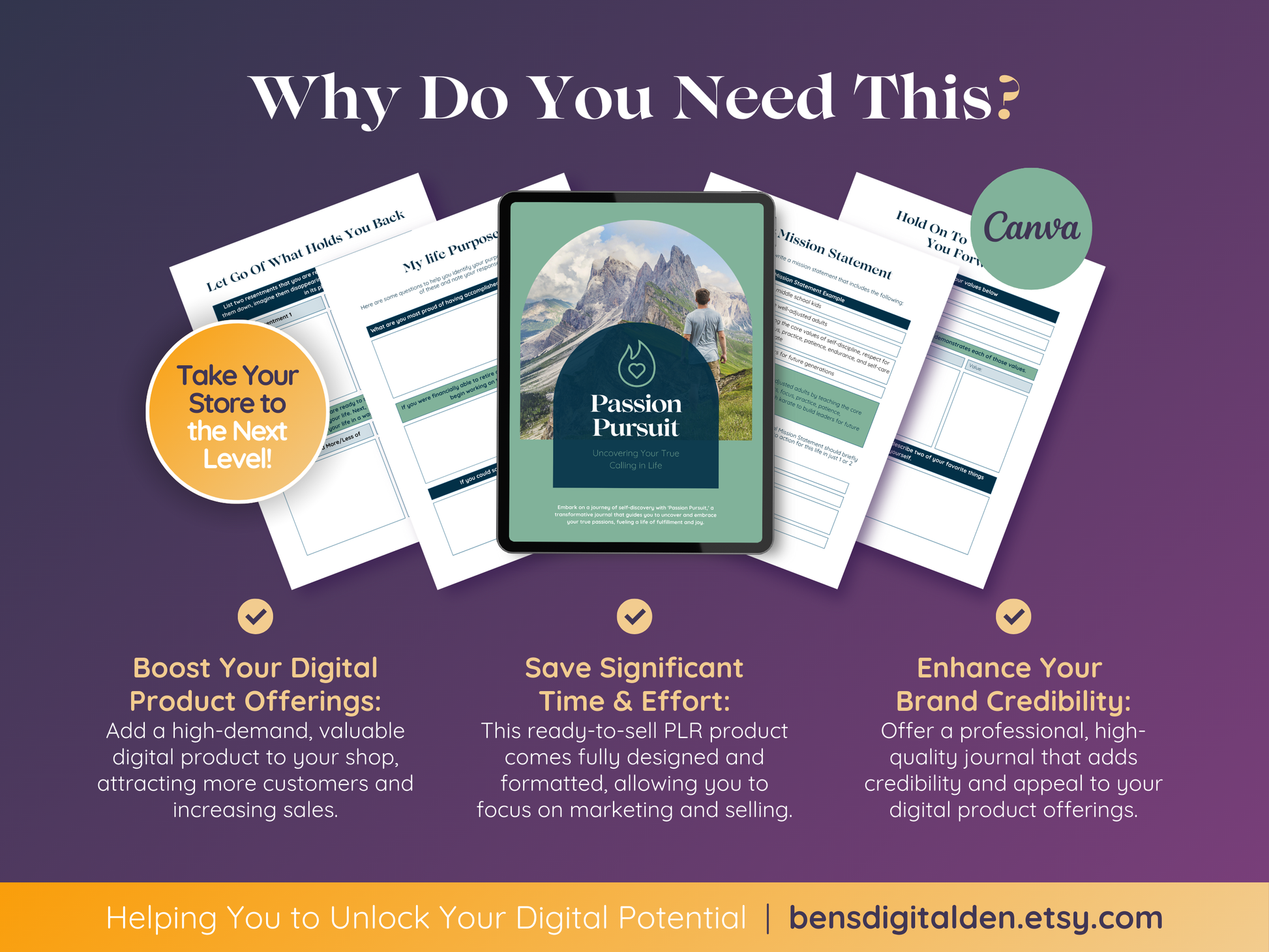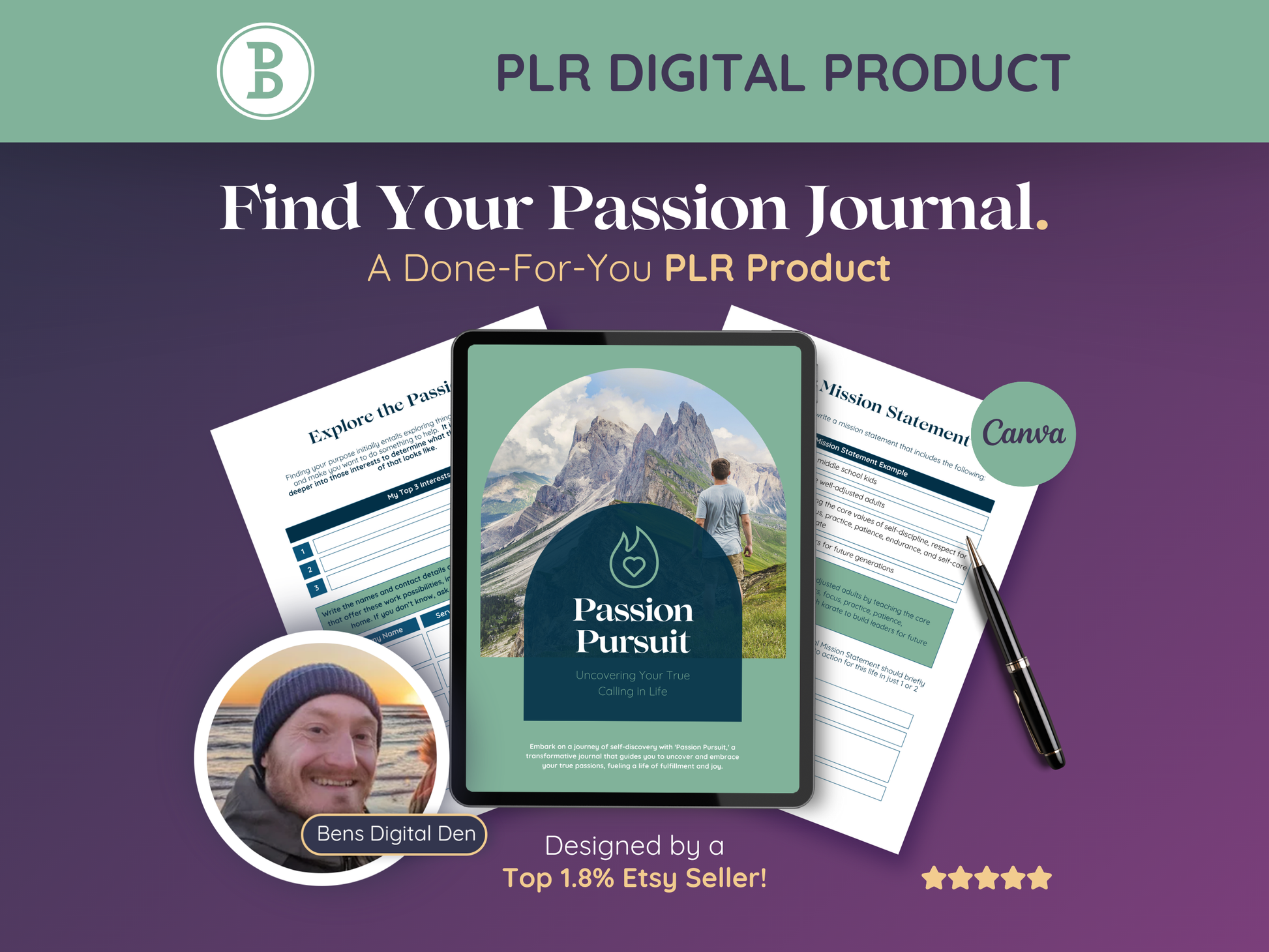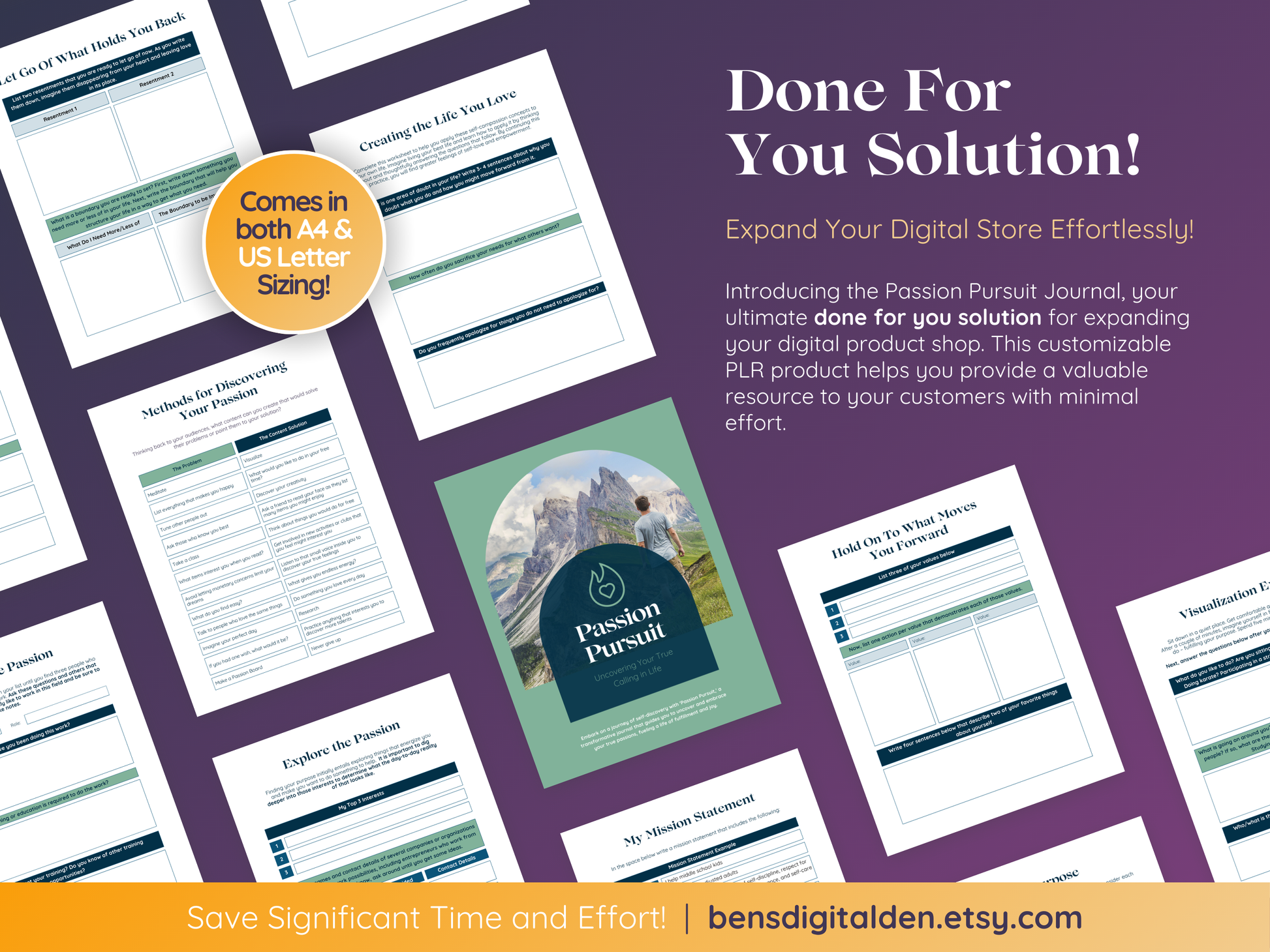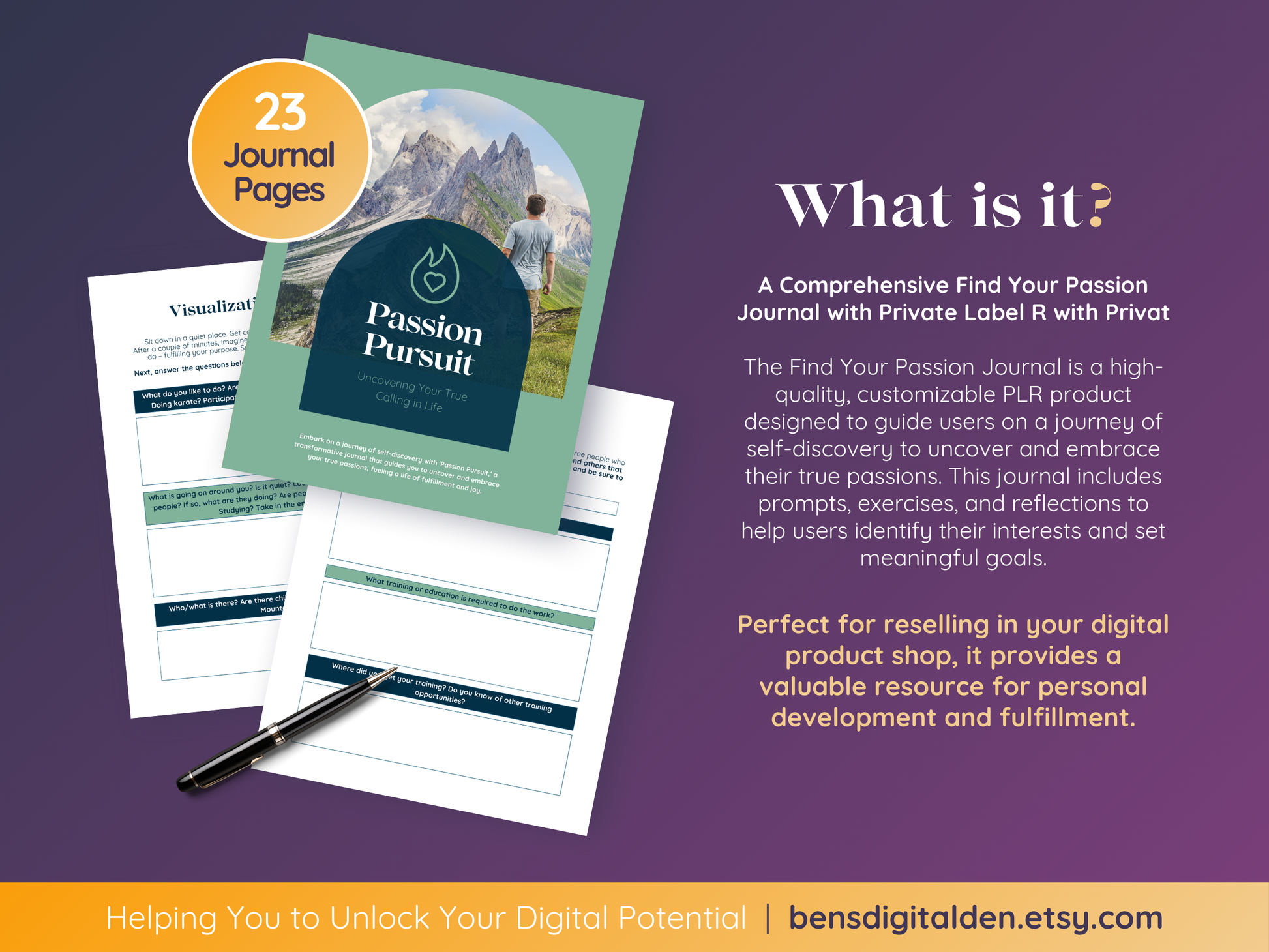 Unlock your potential with the PLR Find Your Passion Journal, a comprehensive resource containing 23 pages designed to guide your journey of self-discovery and personal growth. This digital product is perfect for those seeking to uncover their true passions or for entrepreneurs looking to start or grow their own digital product shop on Etsy. With customizable templates available in both US letter and A4 sizes, this passion journal offers convenience and the opportunity to generate passive income through PLR resell rights.