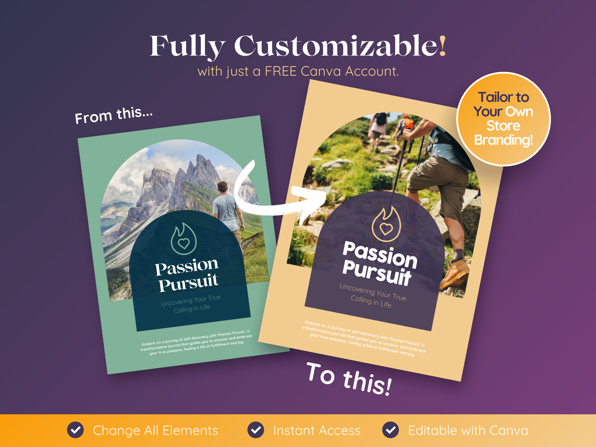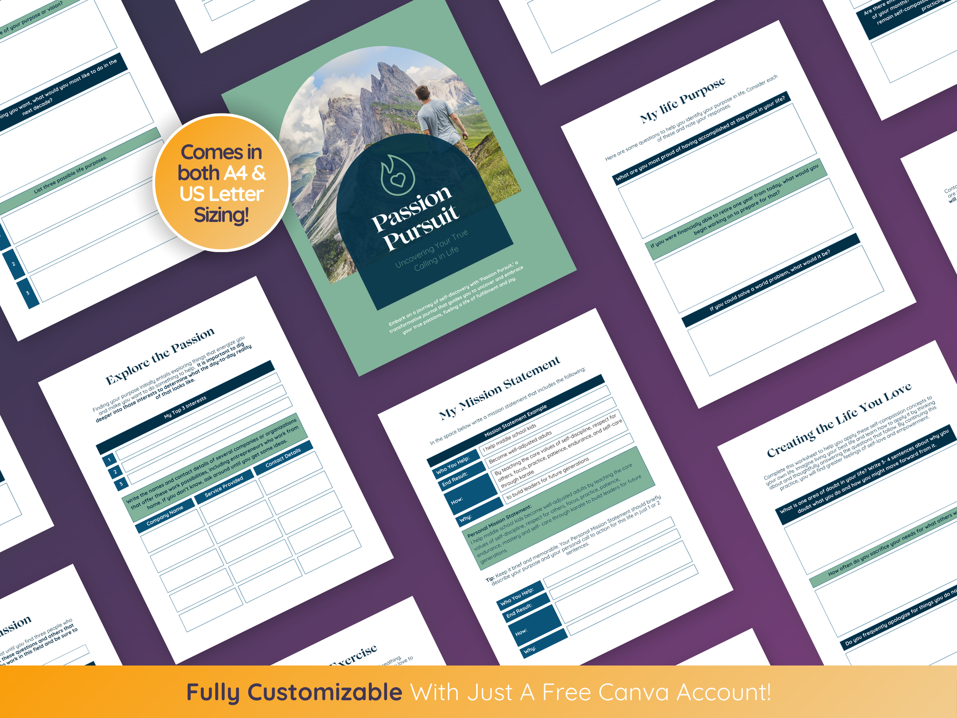 The Find Your Passion Journal is an all-in-one Mindfulness Workbook and Goal Setting Planner designed to help your customers explore their true passions and purpose in life. Crafted with care and available in an easily editable Canva format, this product is perfect for reselling as is or customized to suit your own store branding. It provides a structured way to explore interests, set goals, and reflect on personal growth, helping users to find motivation and direction.