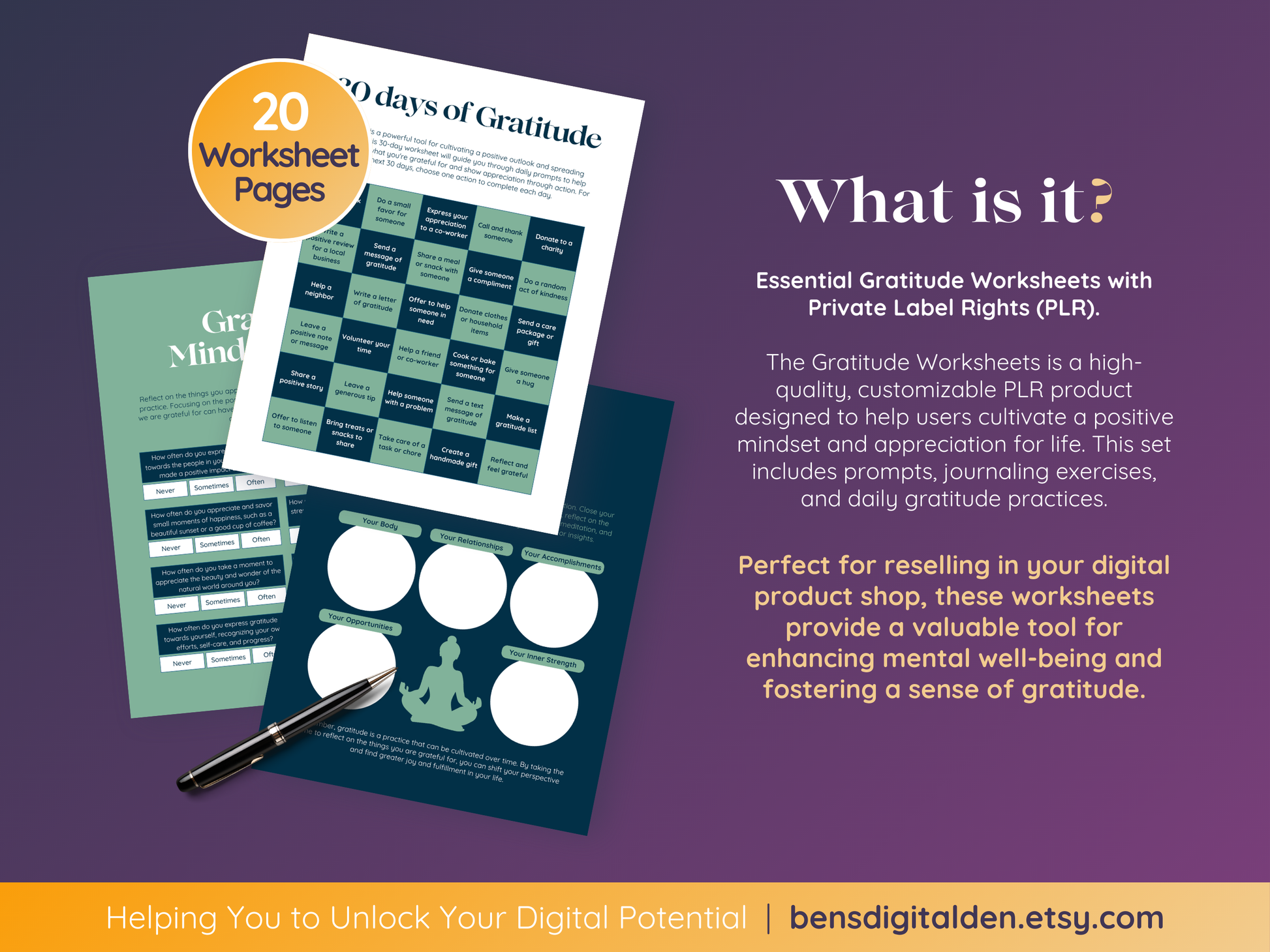 Unlock your potential with the PLR Gratitude Worksheets, a comprehensive resource containing 20 pages designed to guide your journey towards a more positive and appreciative mindset. This digital product is perfect for those seeking to cultivate gratitude or for entrepreneurs looking to start or grow their own digital product shop on Etsy. With customizable templates available in both US letter and A4 sizes, these gratitude worksheets offer convenience and the opportunity to generate passive income through PLR resell rights.