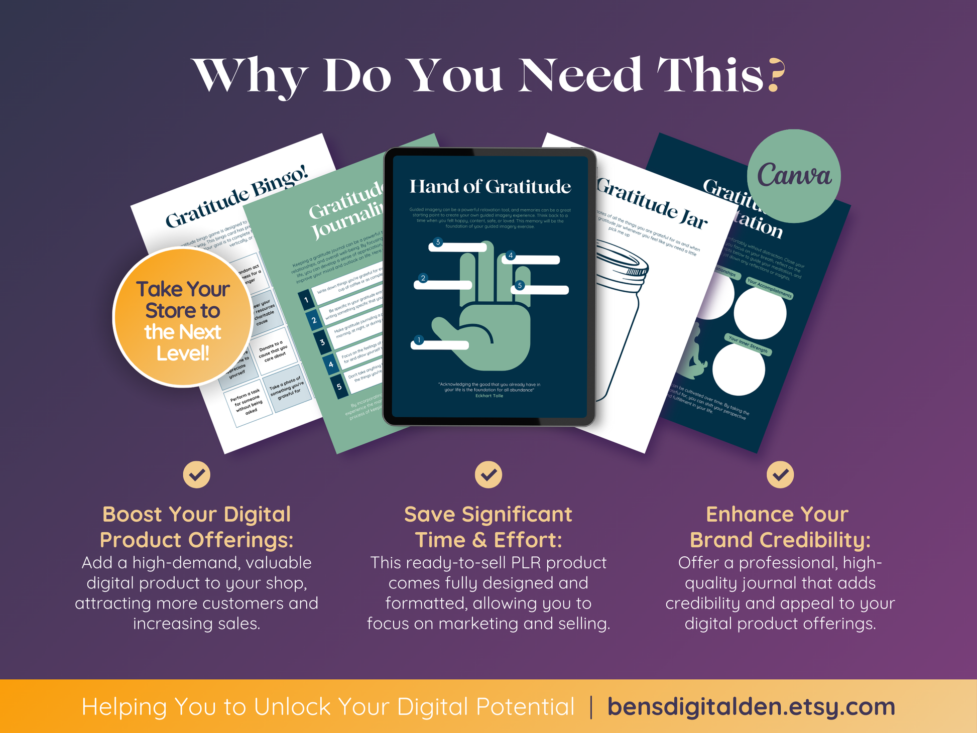 Take control of your gratitude journey and your digital marketing business today! Grab the Gratitude Worksheets and start offering a transformative tool to your customers. Click "Add to Cart" now and begin your path to positivity, self-discovery, and business success.