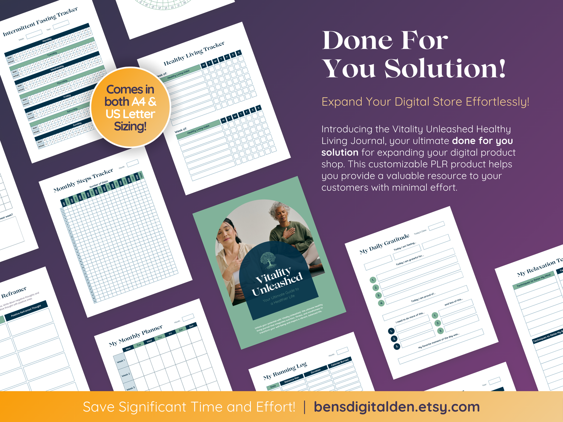 Unlock your potential with the PLR Healthy Living Journal, a comprehensive resource containing 63 pages designed to guide your journey through fitness, nutrition, and self-care. This digital product is perfect for those pursuing a healthy lifestyle or for entrepreneurs looking to start or grow their own digital product shop on Etsy. With customizable templates available in both US letter and A4 sizes, this healthy living planner offers convenience and the opportunity to generate passive income through PLR resell rights.