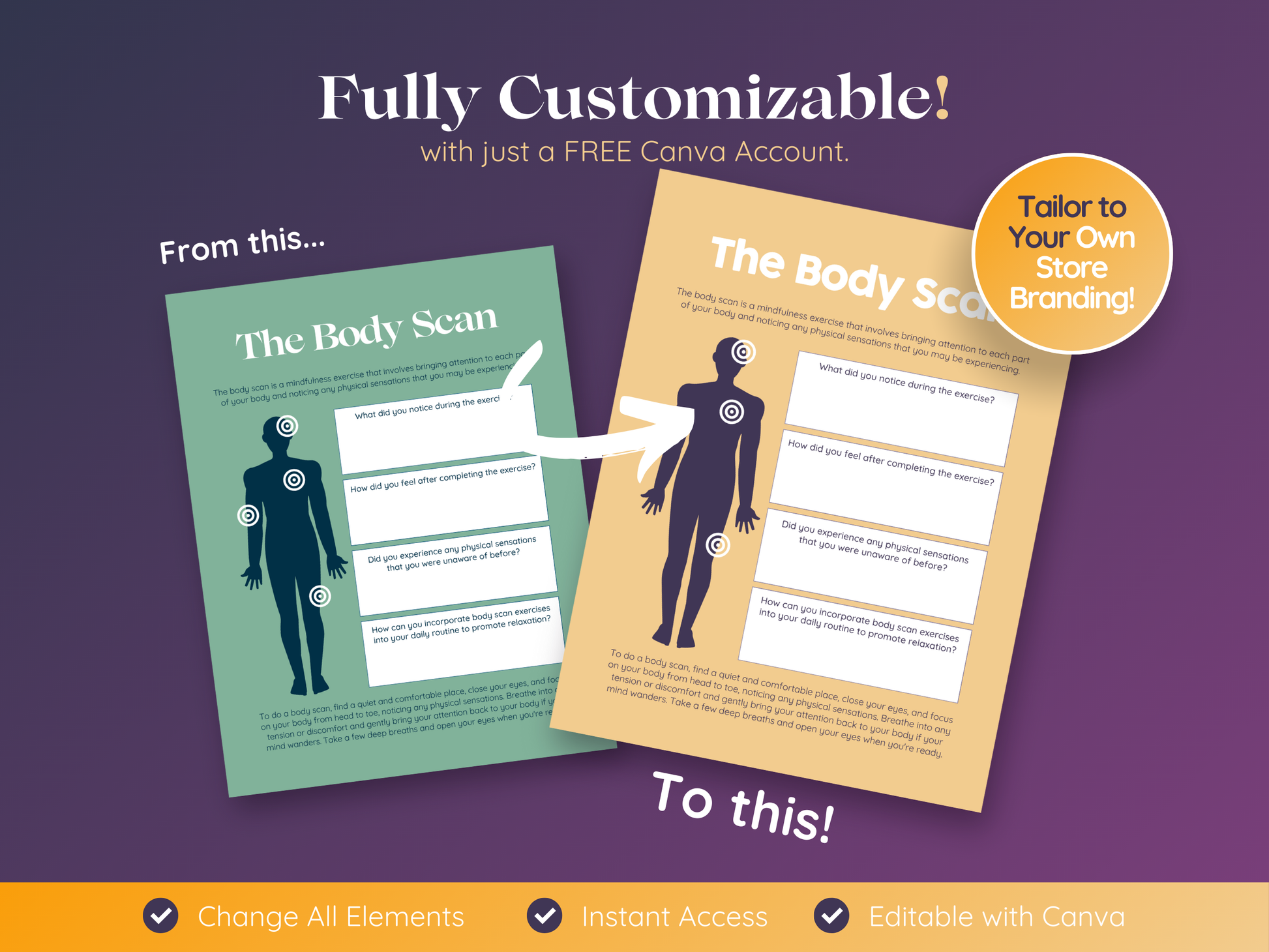 The Relaxation and Mindfulness Worksheets is an all-in-one Digital Planner and Mindfulness Workbook designed to help your customers cultivate mindfulness and reduce anxiety. Crafted with care and available in an easily editable Canva format, this product is perfect for reselling as is or customized to suit your own store branding. It provides a structured way to practice relaxation techniques, self-care routines, and mindfulness exercises.