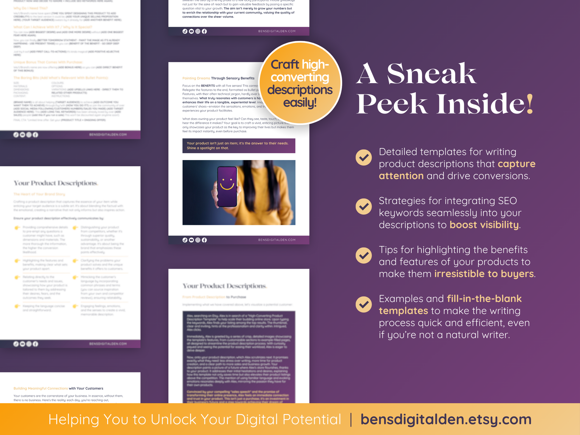 - Detailed templates for writing product descriptions that capture attention and drive conversions.