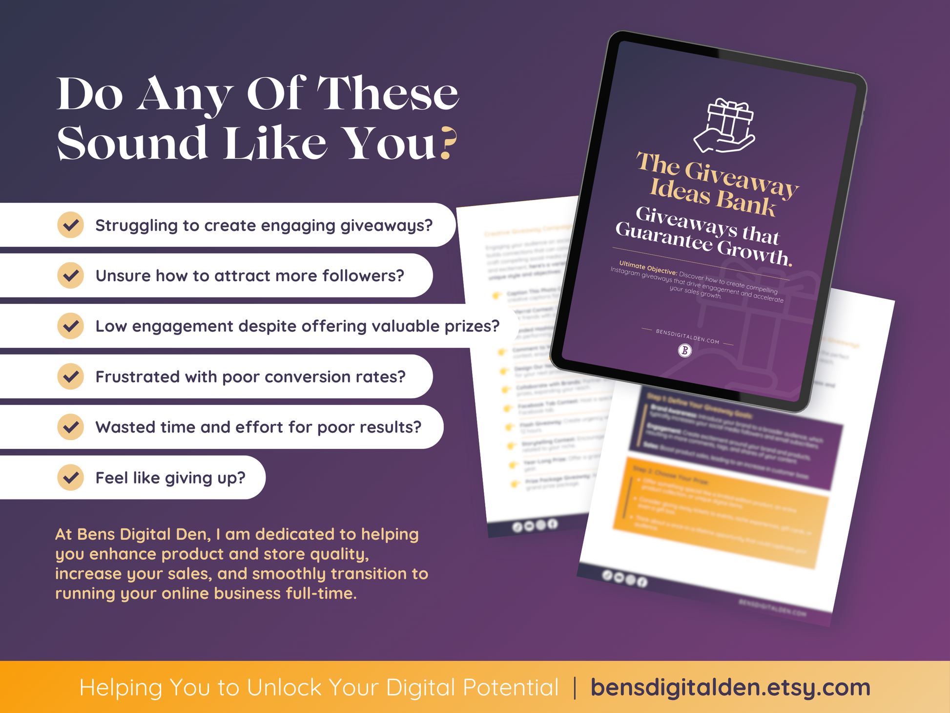 Take Action Now! Don't let ineffective giveaways hold you back. Grab The Giveaway Ideas Bank today and transform your online business. Elevate your brand, increase your engagement, and achieve the success you've always dreamed of. Click "Add to Cart" now and start your journey to Instagram marketing success!