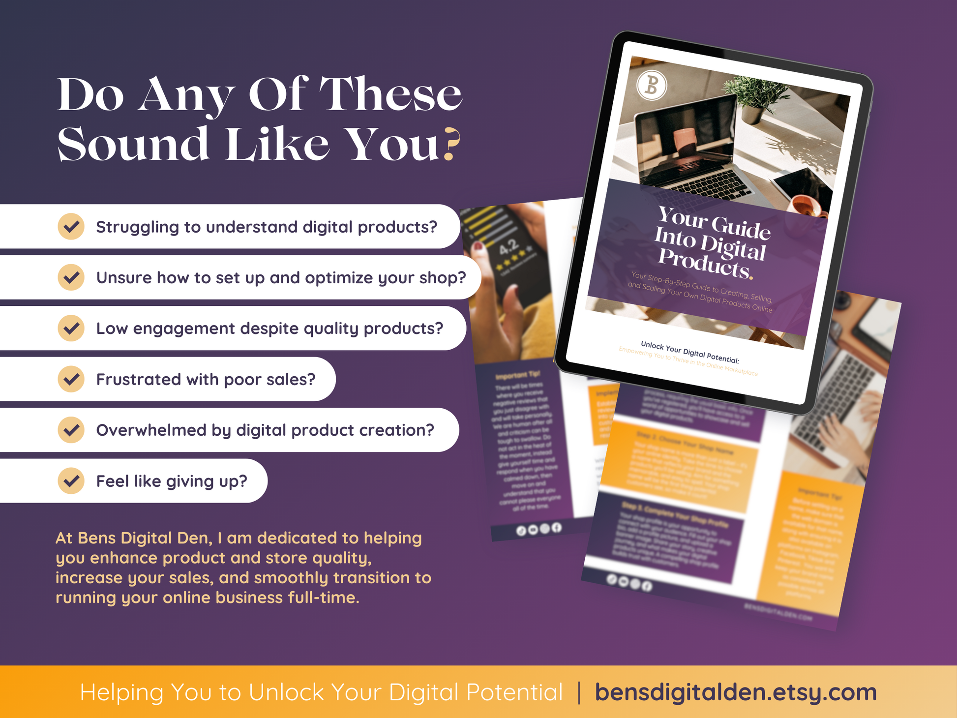 Empower yourself to thrive in the online marketplace with Your Guide Into Digital Products. This comprehensive resource is specifically designed to teach you how to sell on Etsy, create marketable digital products, scale your online business and generate passive income. Packed with actionable strategies and insights, this guide covers everything you need to know about digital marketing, making it an essential tool for any small business. Enhance your Etsy Shop Plan with proven methods to boost visibility, traffic, and sales, turning your digital products into a profitable venture.